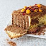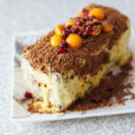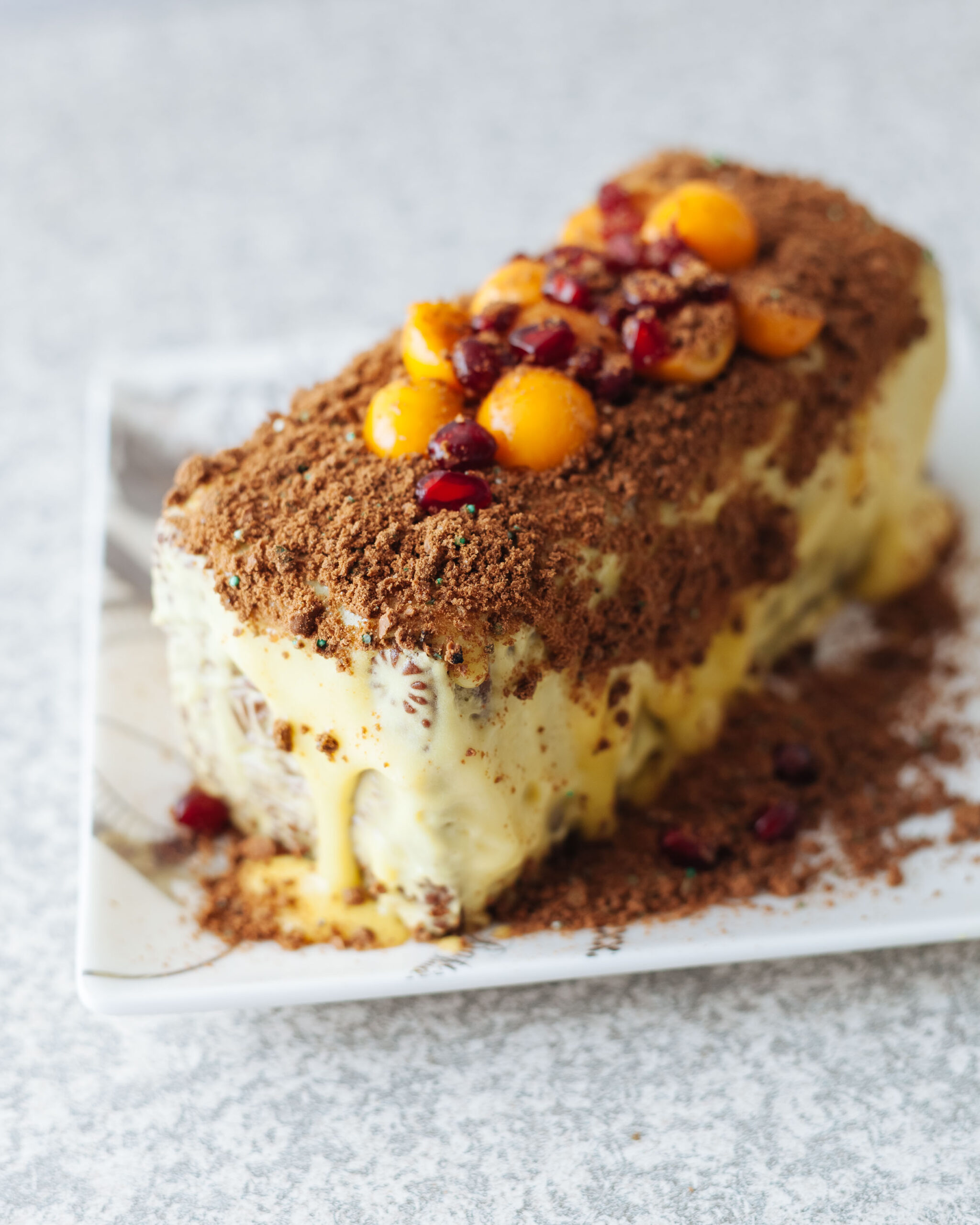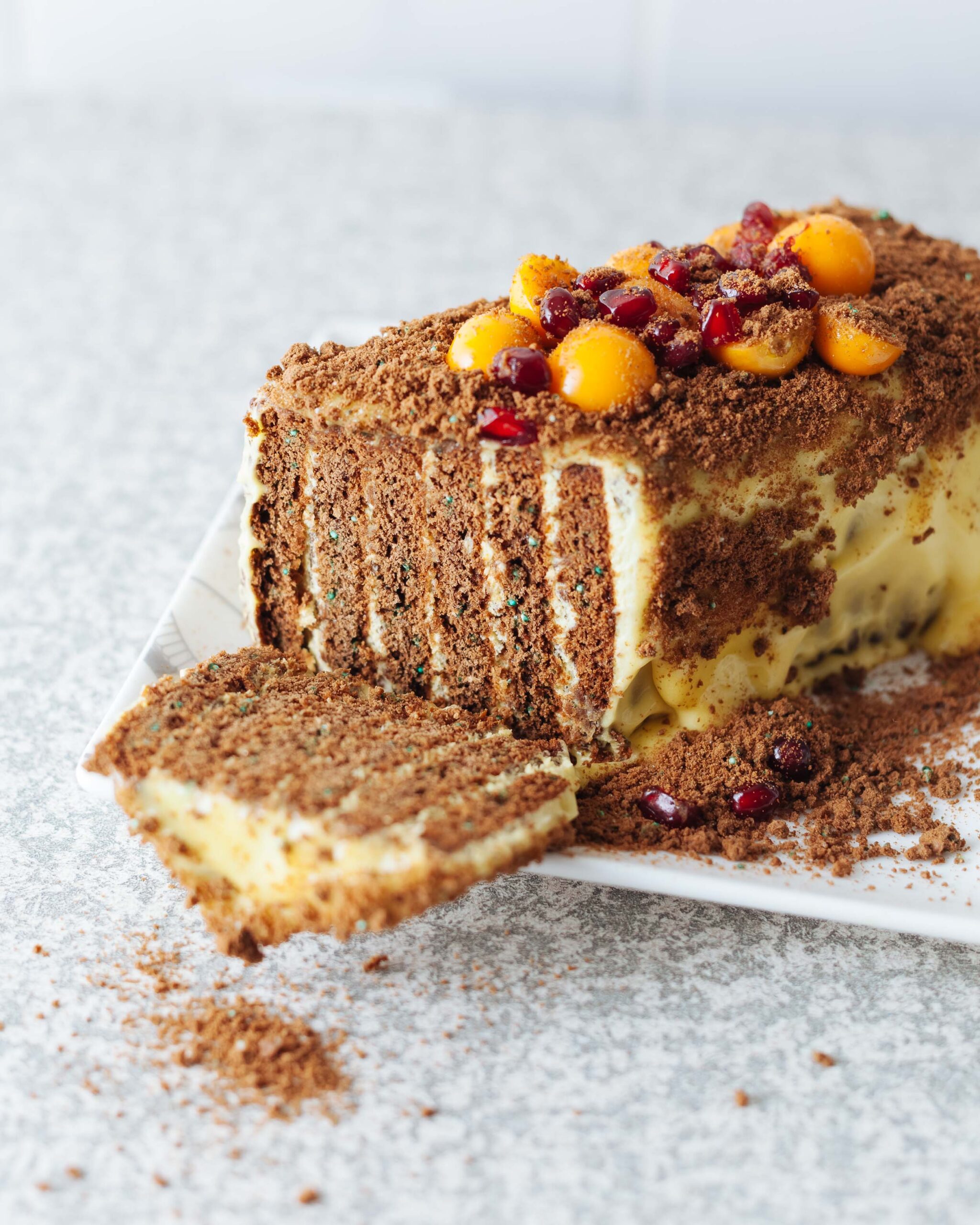 For those who’ve never made this, here’s how you assemble the cake; line a small loaf pan with cling wrap, spread your filling on each biscuit and stack together, place the stack on its side in the pan, spread any leftover filling over the loaf and pull the cling wrap over it to keep it together. Place in the fridge for a few hours to set. To serve, slice the cake on the diagonal.