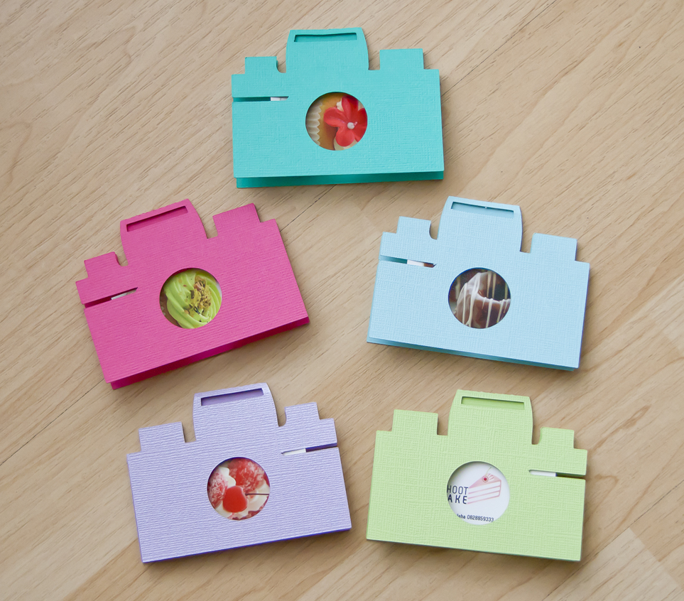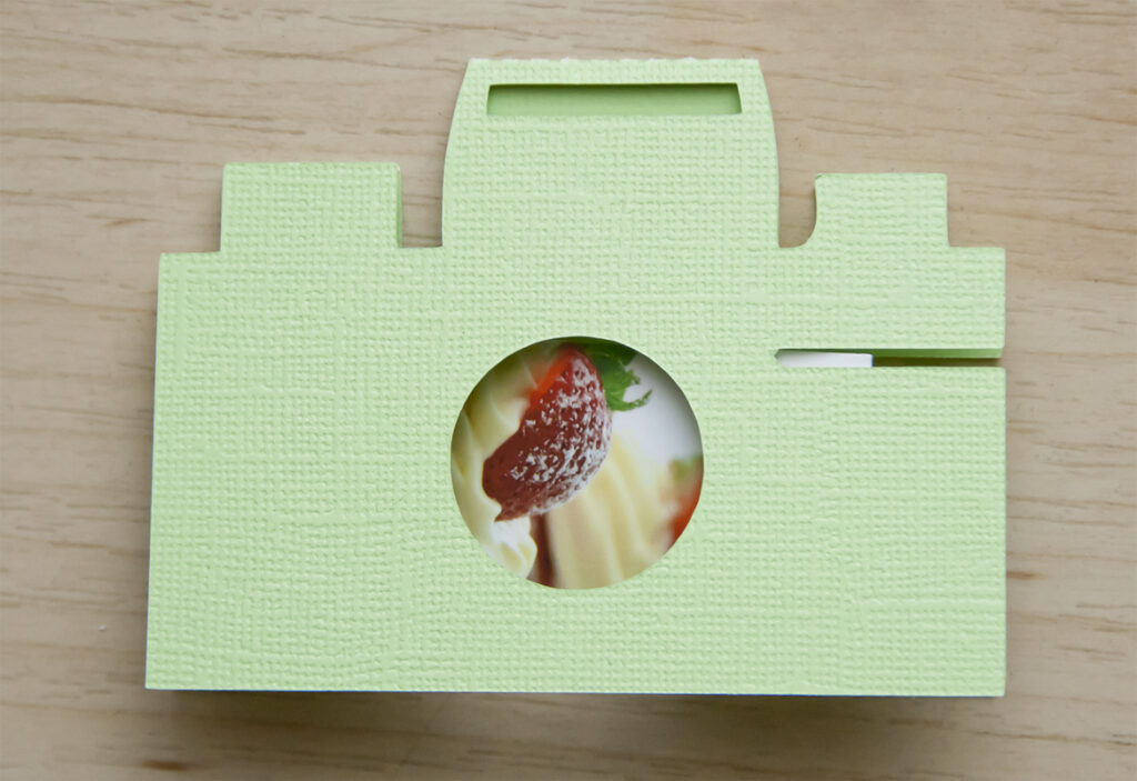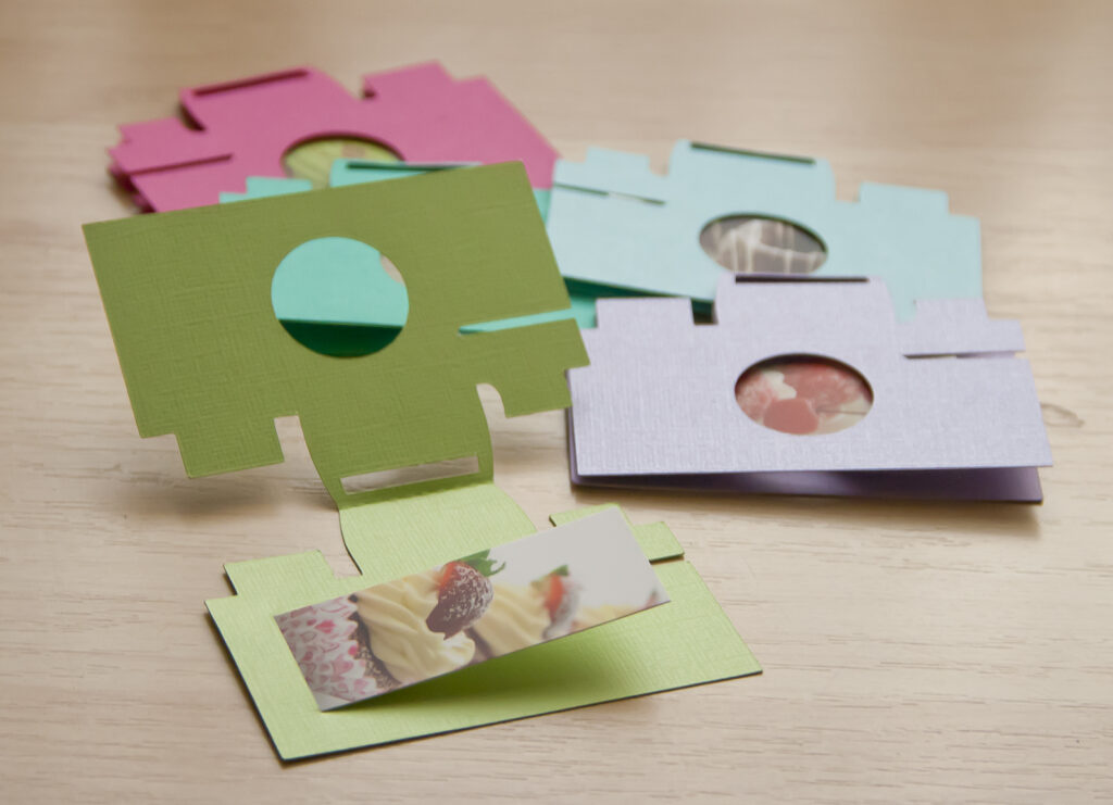 They’re easy to knock together if you have a cutting machine and the design software that talks to it. I altered a camera-shaped dingbat to fit the dimensions of the card, mirrored it to create a flip-open mechanism and inserted a vertical cut for the card to slot through.